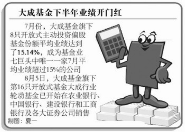本报讯 不少大基金公司下半年业绩取得开门红,其中,大成基金旗下8只开放式主动投资偏股基金份额平均业绩达到了15.14%,成为基金业七巨头中唯一一家7月平均业绩超过15%的公司。8月5日,大成基金旗下第16只开放式基金“大成行业轮动基金”已开始在四大国有商业银行及各大证券公司销售。 (苏 萍)