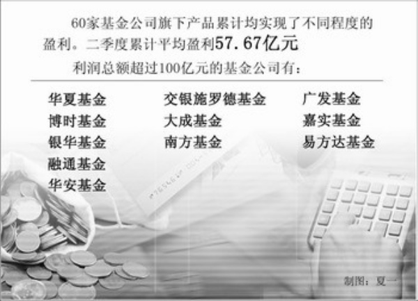 从基金公司方面看,60家基金公司旗下产品累计均实现了不同程度的盈利。二季度累计平均盈利57.67亿元。其中华夏基金公司二季度利润总额达353.01亿元,博时基金公司以225.99亿元的利润总额紧随其后。除这两家基金公司之外,利润总额超过100亿元的基金公司还有银华、融通、华安、交银施罗德、大成、南方、广发、嘉实、易方达等9家基金公司。