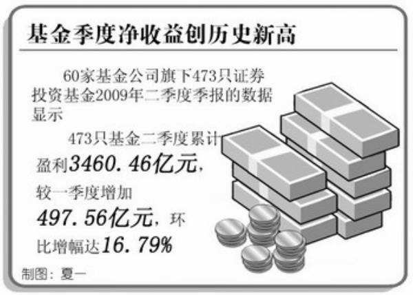 证券投资基金2009年二季度季报显示,60家基金公司旗下473只基金二季度累计盈利3460.46亿元,较一季度增加497.56亿元,环比增幅达16.79%。这一数据刷新了基金季度净收益的历史新高。