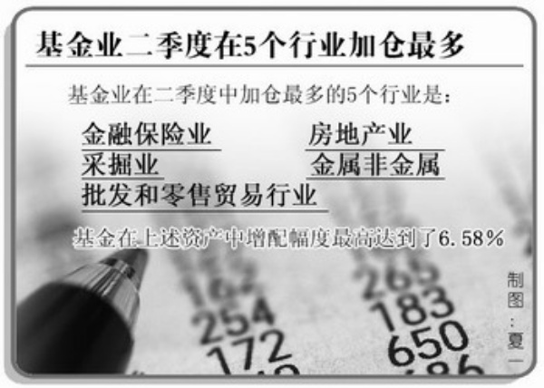统计表明,基金业在二季度中加仓最多的5个行业是金融保险业、房地产业、采掘业、金属非金属、批发和零售贸易行业。基金在上述资产中增配幅度最高达到了6.58%。不过如果剔除上述行业的涨幅外,可以发现,在经历了二季度大幅上涨后,真正得到基金大幅加仓的只有金融保险业和房地产业。