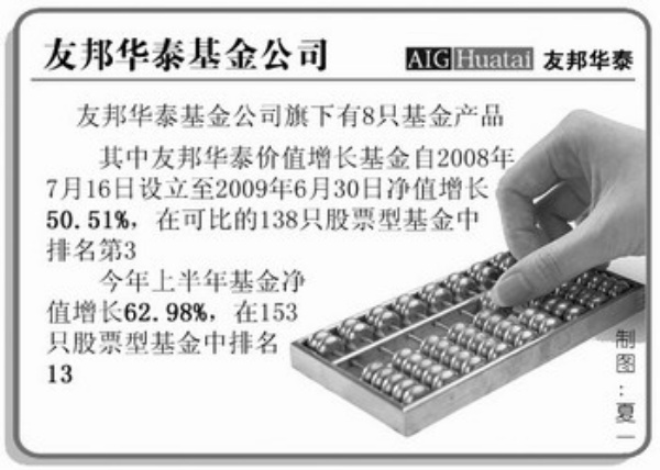 数据显示,友邦华泰基金公司旗下有8只基金产品,其中友邦华泰价值增长基金自2008年7月16日设立至2009年6月30日净值增长50.51%。据国金证券基金研究中心统计,该基金在同期可比的138只股票型基金中(不含指数型)排名第3,相对于同期上证指数的超额收益高达44.04%。数据显示,该基金2008年3季度末的股票仓位仅为23.53%,较好地控制了下跌风险。今年二季度末基金股票仓位增至92.45%,较大幅度享受了股市上涨带来的收益。今年上半年基金净值增长62.98%,在153只股票型基金中排名13。