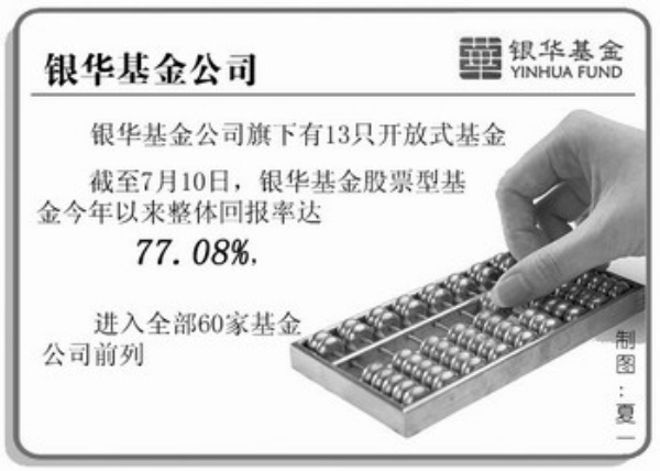 数据显示,银华基金公司旗下有13只开放式基金,凭借积极的资产配置和行业配置策略,银华基金今年以来整体业绩显著,根据晨星最新统计数据显示,截至7月10日,银华基金股票型基金今年以来整体回报率达77.08%,位列全部60家基金公司前列。