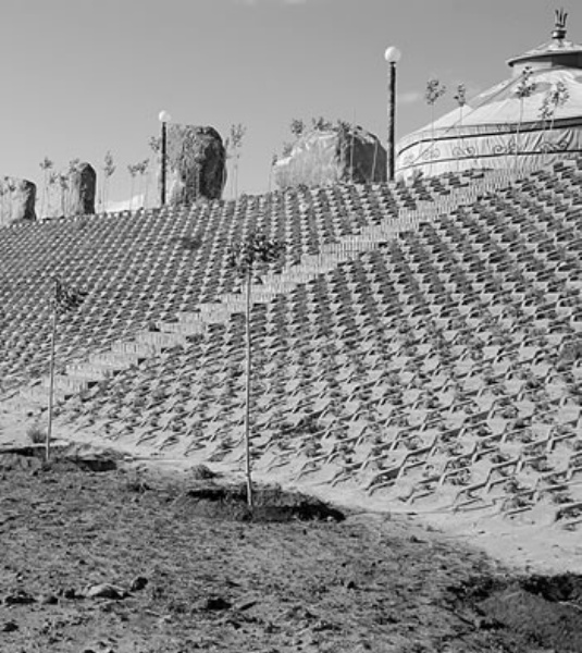 二是这里的排土场也很特别。以前露天煤矿都是挖一片堆一排土堆,逐次往外堆。这里的排土场则把挖出来的土运到露天煤矿的最外围,再一排排往里堆放。锡林浩特矿业公司副总经理任月龙告诉我们,这样堆放土有点麻烦,但好处却很多。一是便于在排土场上绿化,不扬尘。二是降低噪声。记者看到,煤矿周边的斜坡上,工人正在覆盖好的土坡上种草。在离露天煤矿外不远的地方,有一片绿色的苗圃。走近看,这里有红松、柠条等。党委副书记李金根告诉记者,等开挖全面完成再在挖煤形成的排土场上面种树种草要等3至5年。胜利东二号露天煤矿则实现了边开挖边绿化。苗圃为排土场复垦绿化提供了有力的种源支撑。