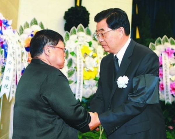 上图:8月10日,卓琳同志遗体在北京八宝山革命公墓火化。胡锦涛、江泽民、吴邦国、温家宝、贾庆林、李长春、习近平、李克强、贺国强、周永康等前往八宝山送别。这是胡锦涛与卓琳亲属握手,表示深切慰问。 新华社记者 鞠 鹏摄