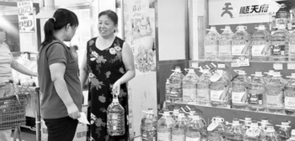 下图:消费者在北京崇文门西花市南里顺天府超市选购大豆油。 刘 婷摄