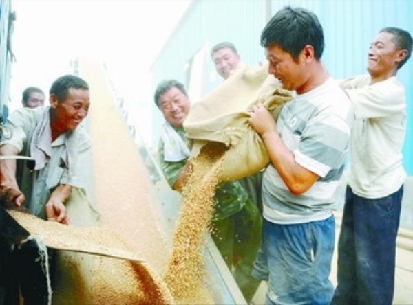 上图:驻马店市盈丰粮油有限公司收购点,来自驿城区古城乡辛庄村的黄军政(右二)等农民喜售夏粮。驻马店市是国家重要的粮油生产基地,素有“中原粮仓”、“中州油库”、“芝麻王国”之称,常年粮食产量占河南省的八分之一,油料总产居河南省第一位。今年夏粮在遭遇特大干旱的情况下,平均亩产和总产仍比上年增长0.92%和1.92%。