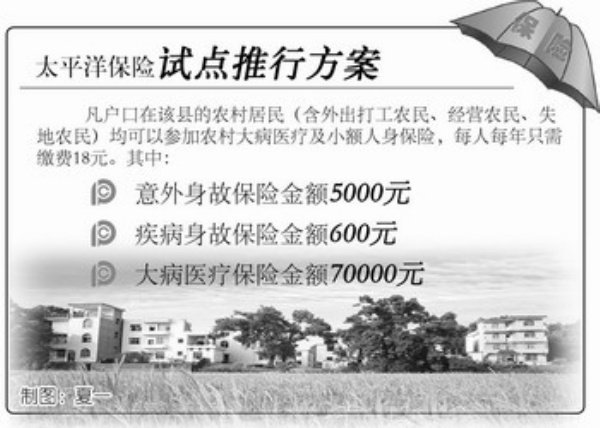 据公司经理朱泽兵介绍,试点推行方案是,凡户口在该县的农村居民(含外出打工农民、经营农民、失地农民)均可以参加农村大病医疗及小额人身保险,每人每年只需缴费18元,其中意外身故保险金额5000元,疾病身故保险金额600元,大病医疗保险金额70000元。与一般商业保险不一样的是,所有参保对象均没有年龄和身体状况限制,使更多年老和患病农民都能够享受到这项保险的保障,而且实现了与新农合无缝对接,完善了农民社会保障体系。