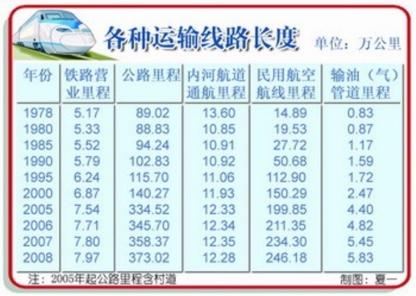 铁路是国民经济的大动脉,“火车一响,黄金万辆”表达了公众对铁路的期盼。2008年,我国铁路营业里程已达到7.97万公里,位居世界第三,亚洲第一;复线铁路和电气化铁路里程均位居亚洲第一。经过持续大规模的新线建设和既有线改造,中国铁路无论是数量还是装备水平都上了一个新台阶,铁路网规模进一步扩大,路网结构得到优化,运输限制明显减少,主要运输通道能力紧张状况大为缓解,基本打破了长期以来铁路对国民经济发展的“瓶颈”制约,改变了铁路运输生产力严重不适应社会经济发展的状况。