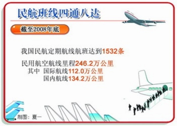 截止到2008年底,我国民航定期航线航班达到1532条,形成了一个国内四通八达、干线与支线相结合以及联结世界主要国家和地区的航空运输网络。目前,全国绝大多数的直辖市、省会、自治区首府以及沿海开放城市和主要旅游城市都拥有较现代化的民用机场,一些边疆地区、少数民族地区、地面交通不便地区也拥有相应规模的民用机场。