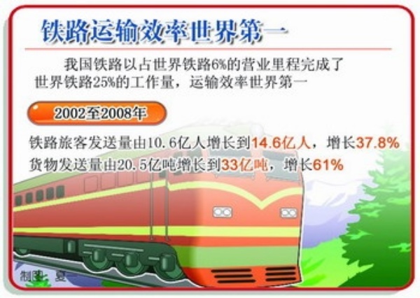 党的十六大以来,通过6次大面积提速,提高列车运行速度,增加列车运行密度,发展重载运输,铁路网综合运输能力大幅度提高,客货运量连年大幅度增长,运输效率和效益大幅度提升。我国铁路以占世界铁路6%的营业里程完成了世界铁路25%的工作量,运输效率世界第一。