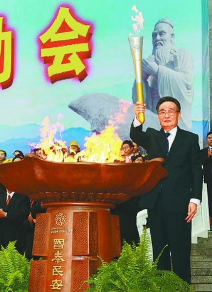 第十一届全国运动会圣火火种取自泰山之巅,象征“国泰民安”。一名火种灯护卫者用引火棒从火种灯中取出火种,点燃白衣少女手中的点火棒。山东省委书记姜异康接过点火棒,点燃“国泰民安”圣火坛。