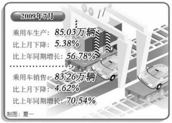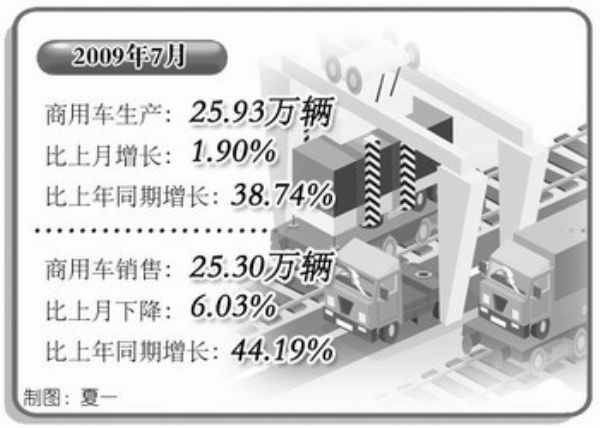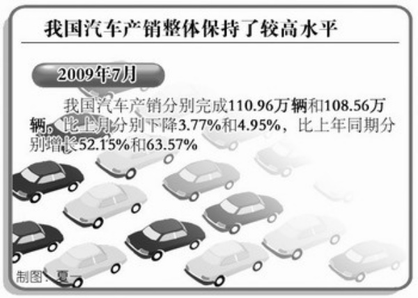 据中国汽车工业协会统计分析,2009年7月,我国汽车产销分别完成110.96万辆和108.56万辆,比上月分别下降3.77%和4.95%,比上年同期分别增长52.15%和63.57%,整体保持了较高水平;从3月起汽车产销已连续5个月达到百万辆水平,创历史纪录。7月是汽车产销传统淡季,但今年的7月表现出产销两旺的好形势。与上月比并没出现大幅下滑,而是延续了上半年的好势头。上半年我国宏观经济企稳回暖,消费者信心提升,国家适时出台了一些促进汽车工业发展的政策,因此汽车产销的快速增长基础是经济好转,动力是政策及时有力,而我国对汽车的刚性需求是汽车形势好转的内在力量。另外半挂牵引车已连续多月出现增长,并且7月份环比增长速度加快,也说明我国宏观经济出现明显好转。