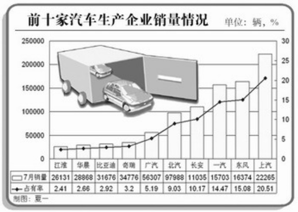 7月,汽车销量排名前10位的生产企业依次为:上汽、东风、一汽、长安、北汽、广汽、奇瑞、比亚迪、华晨和江淮。与上月相比,上汽、东风、广汽和江淮略有增长,其他企业呈一定下降。7月,上述10家企业共销售汽车92.95万辆,占汽车销售总量的86%。