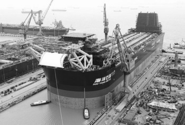 上图:我国第一艘完全自主设计并建造的30万吨海上浮式生产储油轮(FPSO)“海洋石油117”号。这是国内迄今为止交付的吨位最大、造价最高、技术最新的FPSO,标志着我国FPSO设计与建造水平已位居世界先进行列。 (中船集团供图)