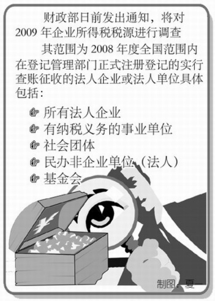 本报讯 记者孙勇报道:财政部日前发出通知,将对2009年企业所得税税源进行调查。通知强调,全国企业所得税税源调查是财政部门研究财税改革方案、制定财税政策的基础,是加强税政分析和财源建设、提高决策水平和执政能力的有效措施,各地区财政部门要确保税源调查数据质量。