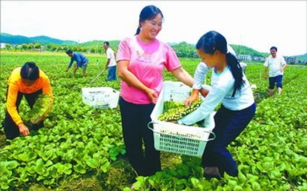 图1:萍乡市芦溪县银河镇陇田村供港蔬菜种植基地,菜农们在采摘丰收的蔬菜。该基地蔬菜面积4000亩,日产蔬菜10吨,产品主要销往香港、澳门,带动了当地农民实现就业增收。