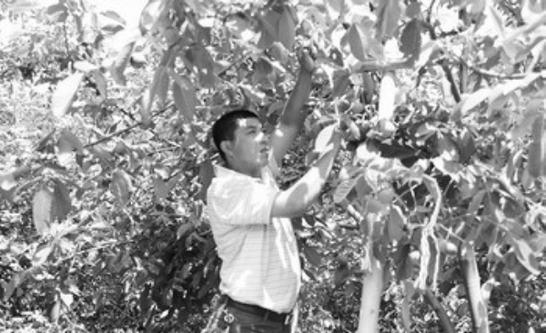青海省循化撒拉族自治县忠华核桃园自1998年引进“338”等核桃品种与当地品种实施嫁接,培育出适宜当地生长的“薄皮核桃”新品种。该品种以皮薄、个大、仁饱满而受市场青睐。图为核桃园员工在忙着给核桃树搭架。