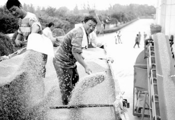8月23日,河南省驻马店市粮油收购站,农民喜售夏粮。驻马店市是国家重要的粮油生产基地,素有“中原粮仓”之称,常年粮食产量600万吨左右,占河南省的1/8。 本报记者 李景录 通讯员 程 恒摄影报道