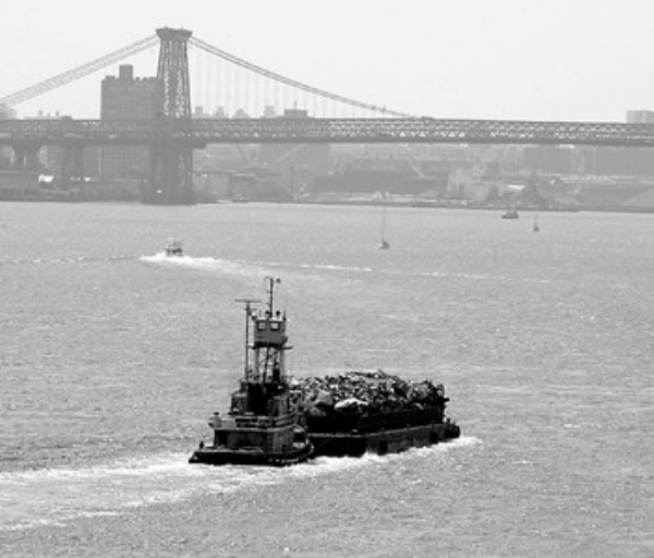 一艘拖船在美国纽约东河上运送已经被碾碎的废旧汽车。