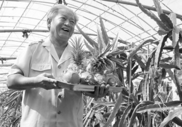 山东莱西市东庄头村为优化当地果蔬经济结构,2007年投资建设了15个大暖棚,创建了热带果蔬科技园。他们大胆引进了火龙果、香蕉、芒果等15种热带果蔬品种,让当地农民开了眼界,增加了收入。图为果农向客人们展示刚采摘下的新鲜的水果。