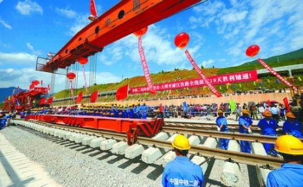 当日,随着最后一节长钢轨铺设就位,大(理)丽(江)铁路全线铺通。国家重点工程项目云南大丽铁路全长165公里,设计时速为120公里,是连接两个文化旅游名城———大理和丽江的铁路大动脉,预计将于今年10月1日正式通车。大丽铁路于2004年12月开工建设,由于大部分铁路建在横断山脉的峰谷山坳之间,施工难度极大,其中桥梁、隧道总长达98公里。