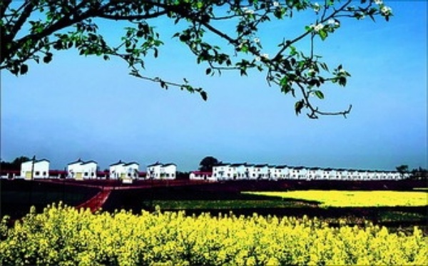 图1:油菜花映衬下的荆门市彭墩村。彭墩村科学规划生产生活,通过迁户腾地,改善环境,发展现代农业,走出了一条环境友好型的发展道路。