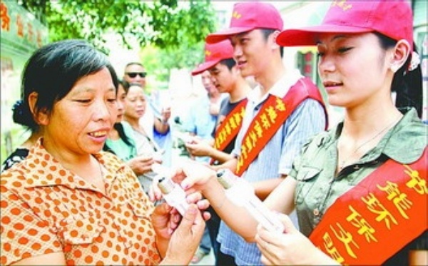图5:荆门市泉口社区的环保志愿者在向市民宣传节能知识。荆门市有关部门在社区和家庭中大力开展节能活动,通过多种形式的宣传、引导和发动,有效普及了节能环保的科学观念。