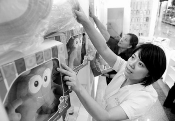 9月3日,北京图书大厦,工作人员忙着推介世博会特许商品。当天,上海世博会特许产品销售专区在图书大厦正式开放。 本报记者 赵 晶摄
