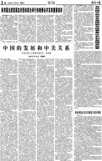 吴邦国出席美国友好团体联合举行的晚餐会并发表重要演讲