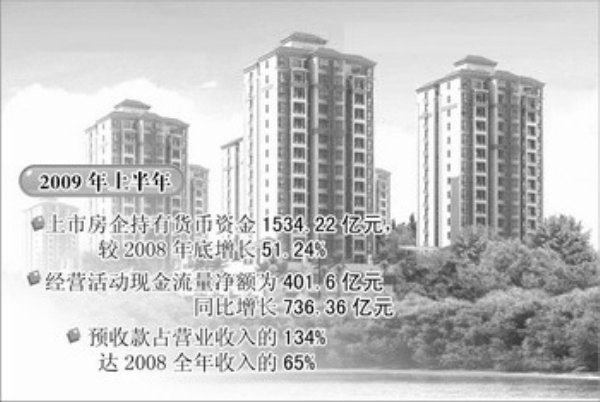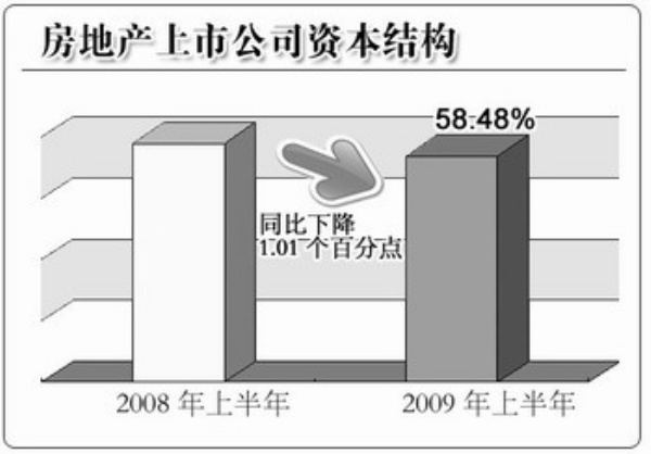 上半年房地产市场的表现超过了不少业界人士的预期,从上市房地产公司中期业绩来看,房地产企业的盈利能力已经有了很大改善,大型开发商所面临的经营压力正在逐步减小。半年报数据显示,上半年上市房企持有货币资金1534.22亿元,较2008年底增长51.24%,经营活动现金流量净额为401.6亿元,而去年同期该指标为—334.76亿元。与此同时,上市房地产公司的资本结构也有了一定好转。除ST公司外,上市房企平均资产负债率为58.48%,同比下降了1.01个百分点。