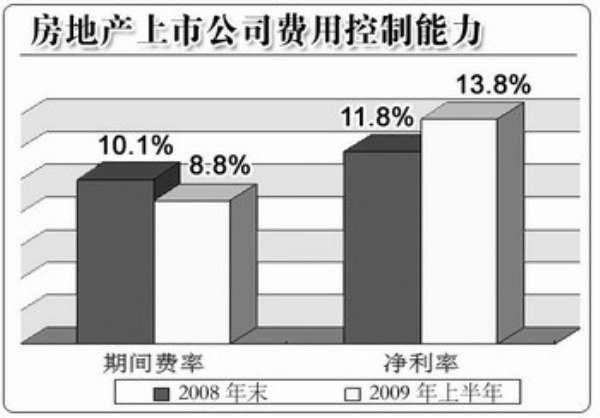 与此同时,上市房企的费用控制能力明显增强,期间费率从2008年末的10.1%下降至8.8%,净利率从2008 年末的11.8%提升到13.8%。上半年业绩显示,2009年上半年,上市房企平均销售毛利率为36.5%,扣除营业税金及附加后为28.3%,相对于去年中期的高点分别下降1.4和1.2个百分点,而相对于今年一季度则上升0.8个百分点。孙建平认为,在毛利率下降的情况下,净利率提升显示了企业费用控制能力的提升。