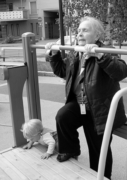 9月4日,在芬兰首都赫尔辛基的一个老年人活动公园,老人和孩子一起锻炼身体。赫尔辛基市政府最近专门在胡奥帕拉赫蒂住宅小区修建了一个老年人活动公园,公园内安装有适合老年人锻炼的各种健身设施和小型跑道。老人活动公园为住在附近的老人提供了一个健身和聚会的场所,深受老人们的欢迎。