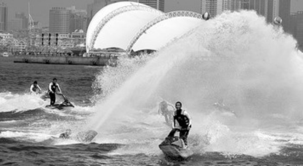 8月12日,在山东青岛举行的国际海洋节上,多项与海洋相关的表演吸引了众多游客。图为骑手在奥帆中心海域进行水上摩托表演。 新华社记者 李紫恒摄
