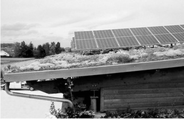 太阳能设备能很好与屋顶绿化进行结合并产生协同效应。德国环境与自然保护联盟宣称,夏季时节,在经过绿化措施处理的屋顶上,太阳能设备的工作效率最高可提升约20%。这是因为太阳能设备的运行温度在达到25摄氏度后,在此基础上每升温1摄氏度,其工作效率就将下降0.5%。与裸露的砖、砂岩或者金属制屋顶相比,绿色屋顶上的植被则对太阳光线几乎没有反射作用,因而太阳能设备的温度会相对较低。在德国夏季,建筑裸顶与绿顶间的温差可达40摄氏度,这对太阳能设备效率的影响也就可想而知,经过绿化措施处理的屋顶比一般的屋顶具有更好的散热功效,美化环境调节温差的同时,也更利于太阳能设备的运转。
