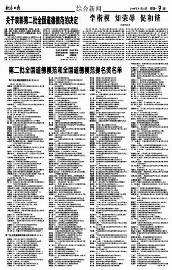 第二批全国道德模范和全国道德模范提名奖名单