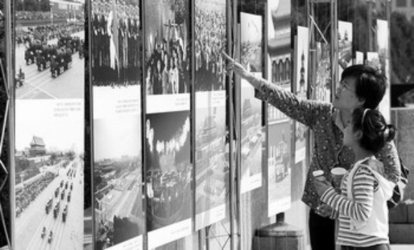 9月20日,参观者在北京中华世纪坛观看《新中国60年经典瞬间》图片展。为庆祝中华人民共和国60华诞,《新中国60年经典瞬间》大型图片展当天在京开幕,展出了大量反映新中国发展历程的珍贵历史图片,分为“开国大典 创业时代”、“艰难历程 激情岁月”、“改革开放 经济建设”、“和谐社会 科学发展”、“历年国庆及阅兵活动”5个部分,向观众展示了共和国60年来走
