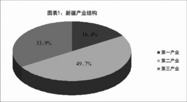 ————经济结构逐渐优化。近年来,新疆工业、农业和第三产业均保持快速发展。工业化进程加快,工业取代农业成为主要产业。第三产业在经济发展中的作用突出,批发、零售贸易和餐饮业发展迅速,邮电通信网络快速普及,房地产、金融等新兴行业快速发展。2008年,一、二、三产业占地区生产总值的比重分别为16.4%、49.7%、33.9%。