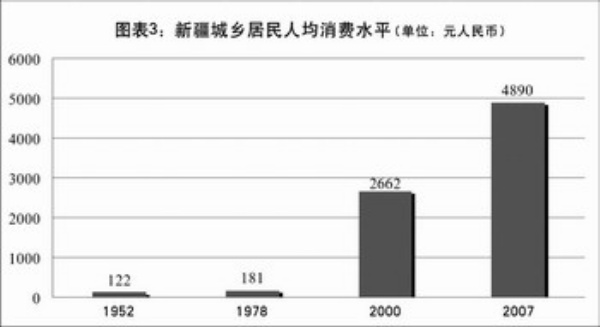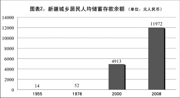 在经历了消除贫困、解决温饱发展阶段后,目前新疆各族人民生活正在向小康迈进,生活质量大幅提高。2008年,新疆农民人均纯收入达3503元人民币,比改革开放初期的1978年增长28倍,比西部大开发初期的2000年增长1.2倍;城镇居民人均可支配收入11432元人民币,比1978年增长35倍,比2001年增长1倍。城乡居民人均储蓄存款余额1955年为14元人民币、1978年为52元人民币、2000年为4913元人民币,2008年为11972元人民币。居民人均消费水平1952年为122元人民币、1978年为181元人民币、2000年为2662元人民币,2007年为4890元人民币。