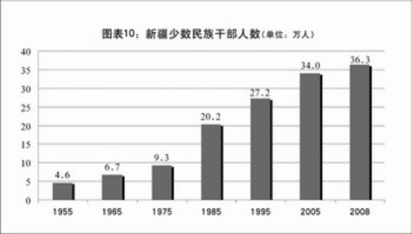 国家和自治区一直把选拔、培养和使用少数民族干部作为实行民族区域自治政策的关键,通过送去学习、加强培训、基层锻炼、异地交流、挂职轮换等多种形式,培养和造就了一大批优秀少数民族干部,少数民族干部队伍的人数和素质大幅提高,并保证各级各类少数民族干部的相应比例。1955年,全疆有少数民族干部4.6万人,1965年为6.7万人,1975年为9.3万人,1985年为20.2万人,1995年为27.2万人,2005年为34.0万人,2008年为36.3万人,占全疆干部总数的51.25%。目前,自治区的政府主席、各自治州的州长、自治县的县长以及相应的人大常委会主任、人民法院院长、人民检察院检察长都由实行民族区域自治的民族的公民担任,绝大多数的地、州、市的专员、州长和市长以及县长、区长由少数民族干部担任。