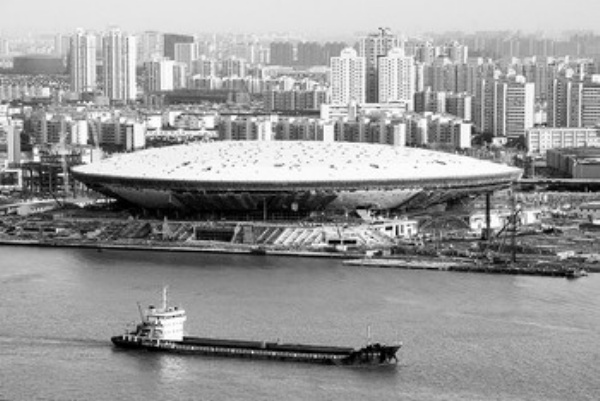 9月20日拍摄的正在施工的上海世博园区永久性标志建筑————演艺中心。 近日,上海世博园区建设正紧张进行,五大永久性标志建筑“一轴四馆”(世博轴、中国馆、主题馆、演艺中心、世博中心)已全部封顶,进入内部装修施工阶段。 新华社发