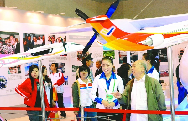 9月21日,观众在北京展览馆展厅观看大飞机模型。正在北京展览馆举行的“辉煌60年———中华人民共和国成立60周年成就展”通过一大批照片、实物、模型等真实记录了新中国的发展史,展示我国60年经济建设的辉煌成就和发展成果,深深震撼了广大观众,引发了强烈的共鸣。 本报记者 李树贵摄