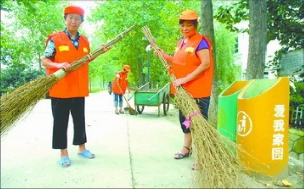 图三:方营村的卫生保洁员们正在清运垃圾。老河口市每年划拨12万元,为每村配备了保洁员,实现了柴草归院、垃圾归点、禽畜归圈、污水归池,让农民生活环境大为改善。