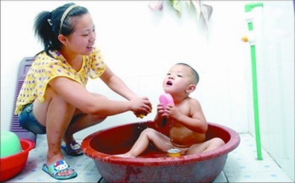 图六:李楼村村民李丽萍在自家卫生间里给孩子洗澡。老河口市大力推进新农村建设向纵深发展,通过实施“改厕”工程,1万多户村民家的旱厕被改造成了明亮、干净、整洁的卫生间。