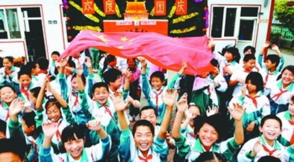 上图 9月18日,北京市海淀区行知实验学校,学生们挥舞国旗,祝贺新中国60华诞。连日来,北京市多个学校纷纷开展“祝福祖国”等主题活动,通过歌咏、诗歌、绘画等形式,表达对祖国的热爱之情。