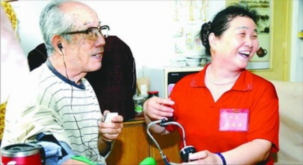下图 孙牛凤(右)退休后在社区做志愿者,是有名的热心肠,社区的居民们有什么事儿都愿意找孙牛凤帮忙。