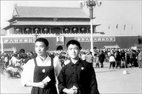 下图 为迎接新中国成立60周年,曹虎(右)即兴写下“风雨同舟 无比自豪”,表达心中的喜悦之情。
