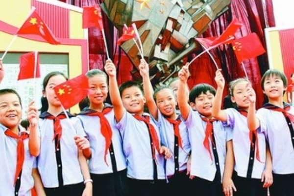 左图 9月25日,上海国歌纪念广场举行落成典礼,小学生们在广场上挥舞国旗。