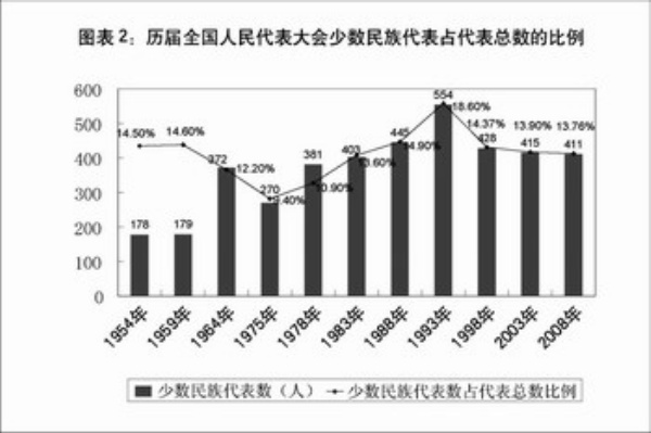 ———平等地享有管理国家事务的权利。在中国,各少数民族与汉族以平等的地位参与国家事务和地方事务的管理。宪法第三十四条规定:“中华人民共和国年满十八周岁的公民,不分民族、种族、性别、职业、家庭出身、宗教信仰、教育程度、财产状况、居住期限,都有选举权和被选举权”。不仅如此,法律还为少数民族的政治参与给予了特殊保障。全国人民代表大会和地方各级人民代表大会,是中国各族人民行使国家权力的机关。《中华人民共和国全国人民代表大会和地方各级人民代表大会选举法》规定:在同一少数民族人口不到当地总人口15%时,少数民族每一代表所代表的人口数可以适当少于当地人民代表大会每一代表所代表的人口数,人口特别少的民族至少也应有一名代表。历届全国人民代表大会中,少数民族代表人数占全国人民代表大会代表总人数的比例,均高于同期少数民族人口占全国总人口的比例。第十一届全国人民代表大会常务委员会161名委员中,有少数民族人士25名,占15.53%。(见图表2)