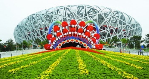 九月二十七日,国家体育场“鸟巢”旁的“九州同庆”主题花坛。目前,北京各类国庆景观的布置工作已经就绪。国庆期间,各色花卉装点下的首都将以优美的景观、浓厚的节日气氛,盛装迎接各方宾朋。 本报记者 赵 晶摄
