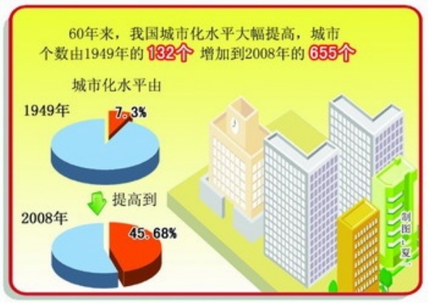 新中国成立60年来,我国城市化水平大幅提高,城市个数由新中国成立前的132个增加到2008年的655个,城市化水平由1949年的7.3%提高到2008年的45.68%。